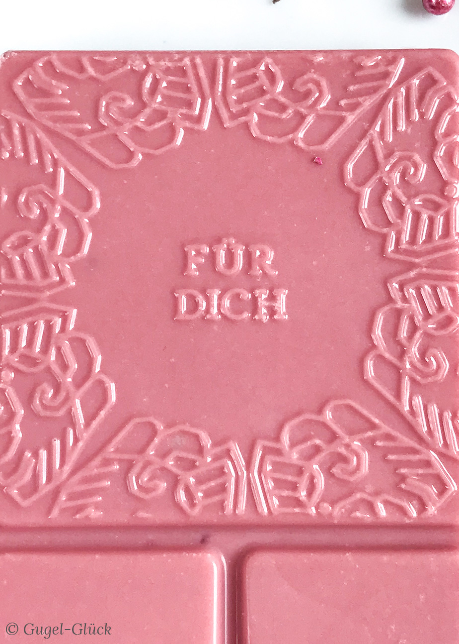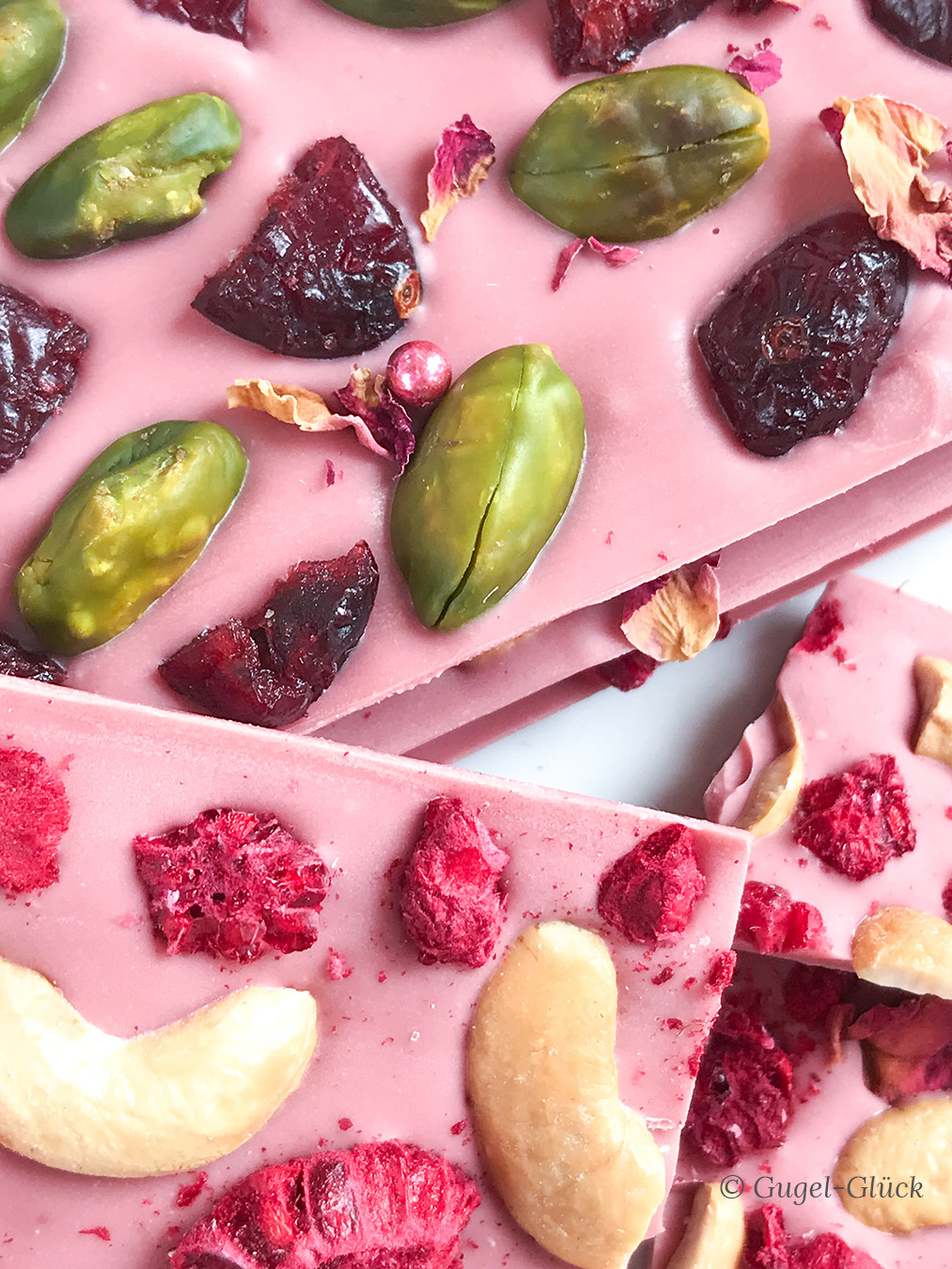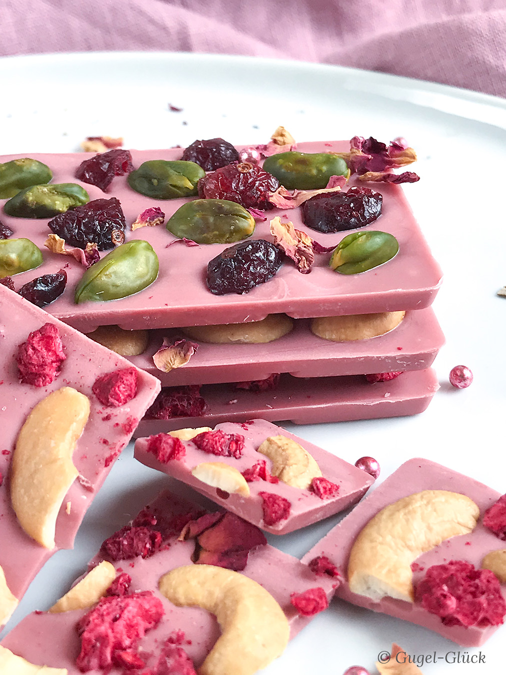 Dieses Jahr verwende ich eine ganz besondere Schokolade, sie heißt Ruby und hat eine wundervolle rosa Farbe. Das besondere daran ist, dass sie nicht eingefärbt oder aromatisiert ist. Sie wird aus der seltenen Ruby Kakaobohne gewonnen und hat einen beerig-fruchtigen Geschmack mit einer leicht säuerlichen Note. Sie ist eine ganz neue Schokoladensorte, neben dunkler, Milch- und weißer Schokolade. Ich finde sie einfach großartig und bin total verliebt in diese neue Schokoladensorte.
