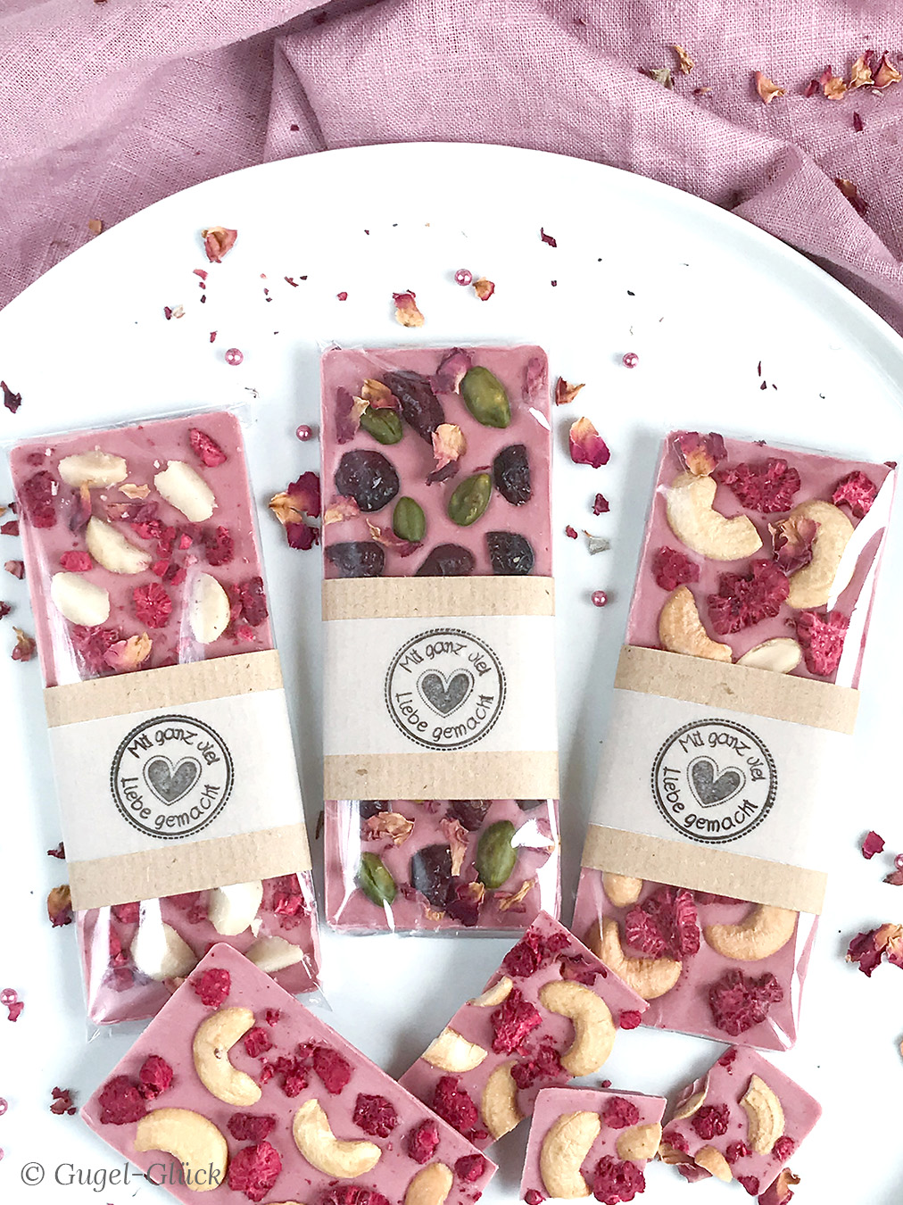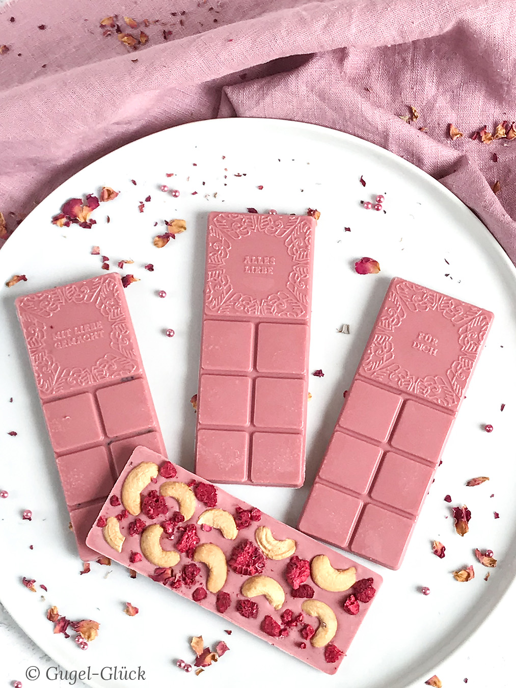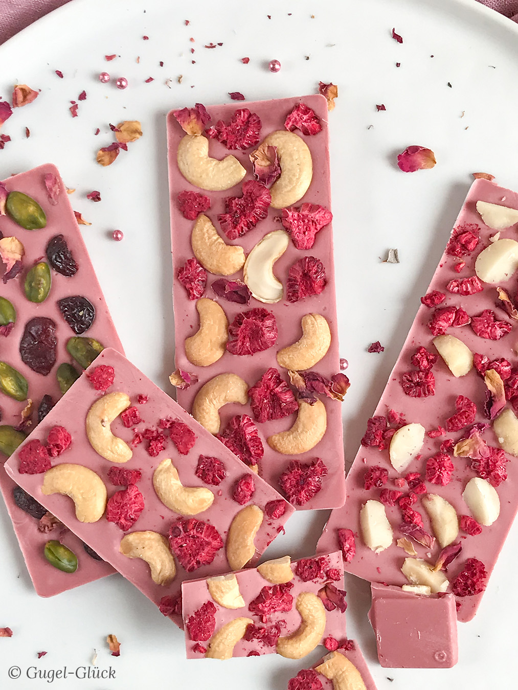 Dieses Jahr verwende ich eine ganz besondere Schokolade, sie heißt Ruby und hat eine wundervolle rosa Farbe. Das besondere daran ist, dass sie nicht eingefärbt oder aromatisiert ist. Sie wird aus der seltenen Ruby Kakaobohne gewonnen und hat einen beerig-fruchtigen Geschmack mit einer leicht säuerlichen Note. Sie ist eine ganz neue Schokoladensorte, neben dunkler, Milch- und weißer Schokolade. Ich finde sie einfach großartig und bin total verliebt in diese neue Schokoladensorte.