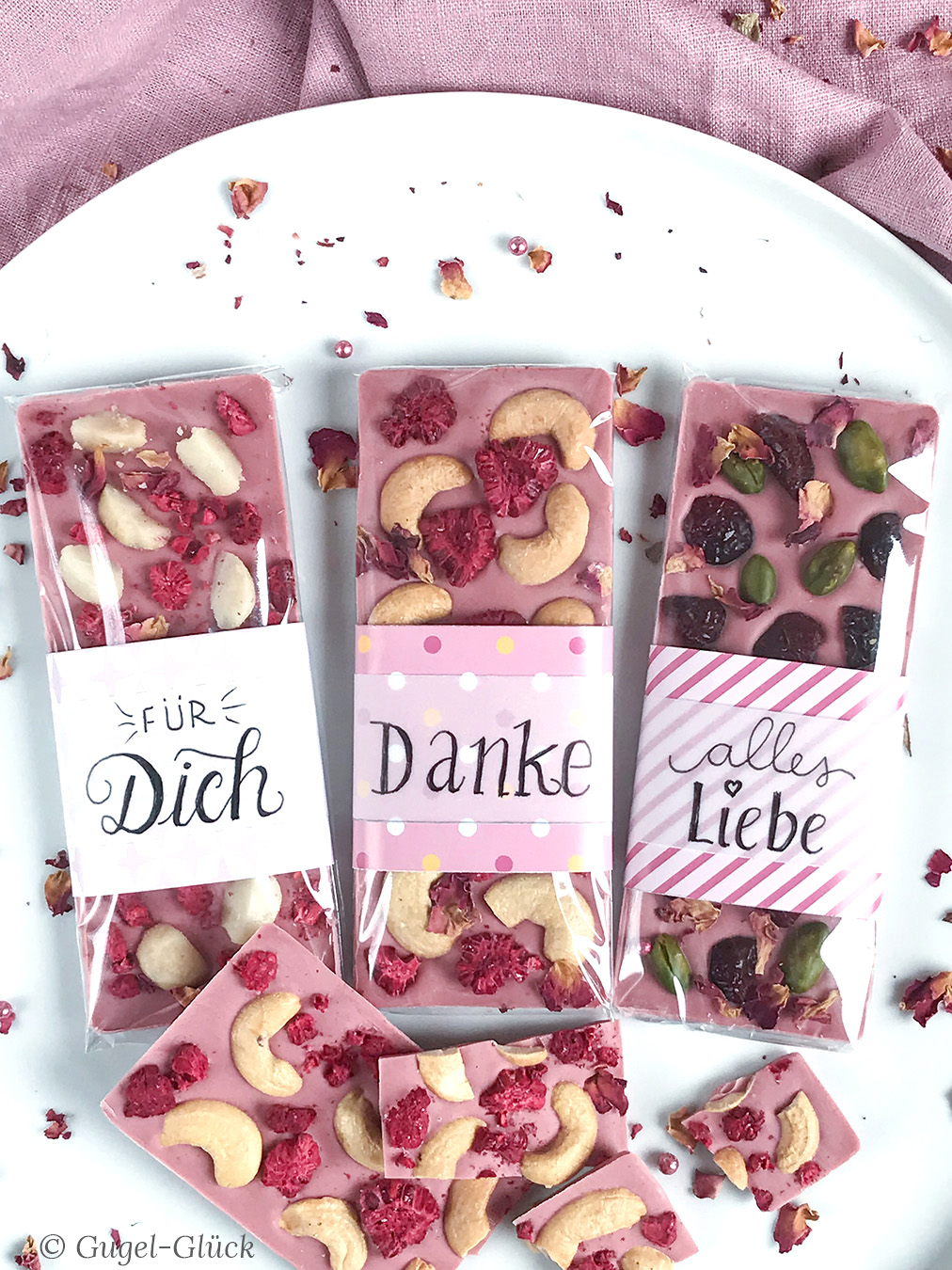 Diese selbstgemachte Schokolade ist auf jeden Fall ein schönes Mitbringsel z. B. zum Muttertag, dass Ihr ganz nach dem Geschmack des Beschenkten individuell gestalten könnt. Das ist das schöne an dieser Schokolade, Ihr könnt eurer Fantasie freien Lauf lassen und beliebige Zutaten kombinieren: Nüsse, getrocknete Früchte, Rosenblüten, Schokolinsen, Kekse, usw.