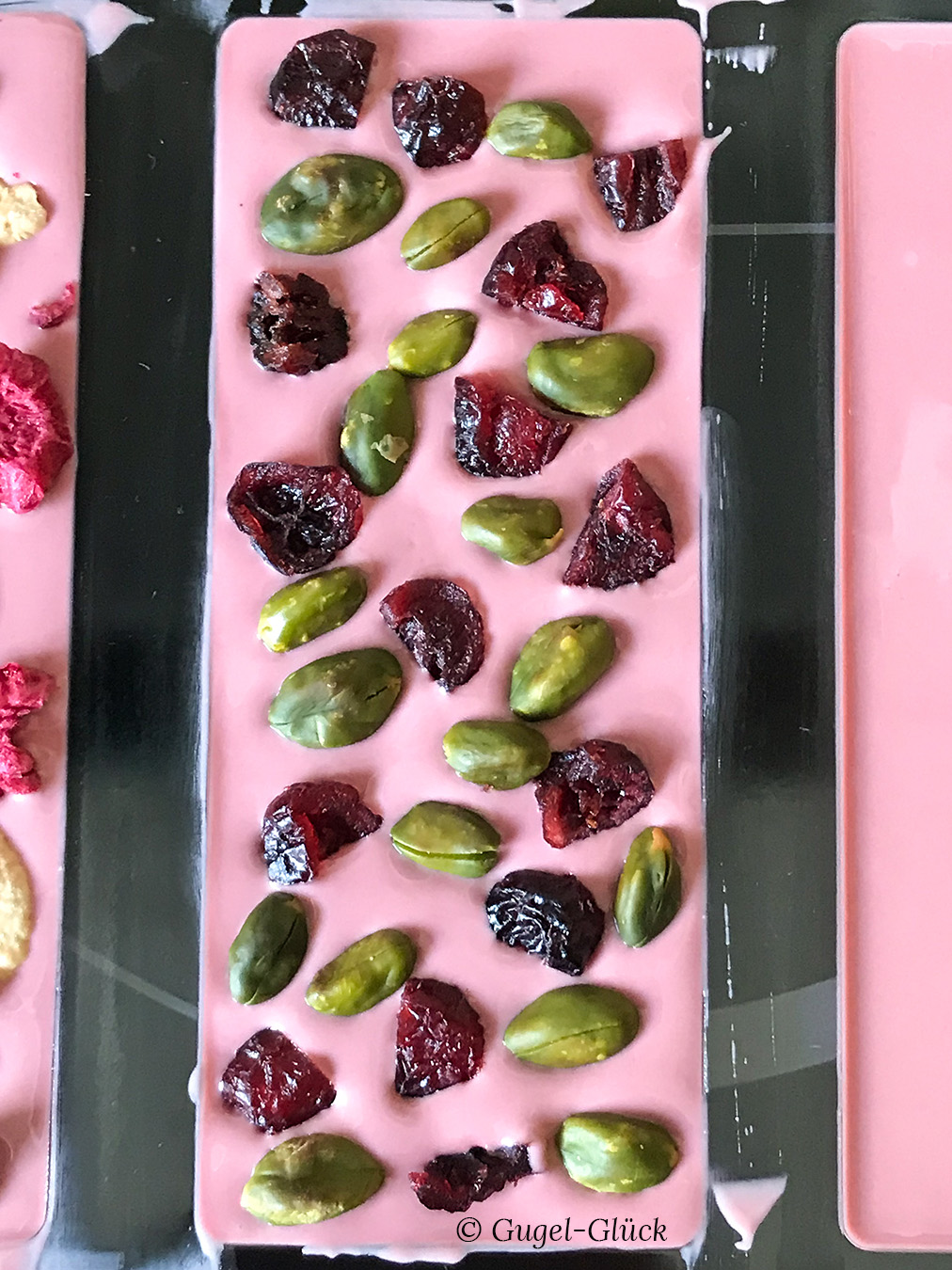 Zu der Schokoladensorte Ruby passen meiner Meinung nach am besten rote Früchte, Cashewnüsse, Pistazien und Kokos. Ich habe mich für die Herstellung von 3 Schokoladensorten entschieden: